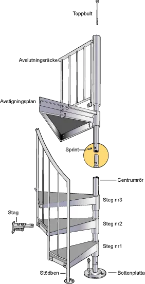 Centrumröret består av ett runt rör där dimensionen bestäms av trappans storlek. Som standard är rördimensionen Ø76,1 x 5,6 för radie 500-850 mm och Ø127 x 6,3 för radie 900-1500 mm.